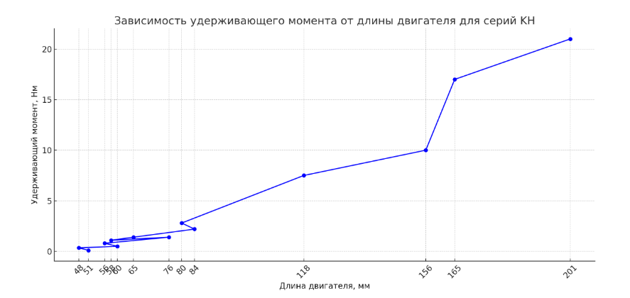 График зависимости удерживающего момента от длины двигателя для серий KH. На нём видно, что с увеличением длины двигателя растёт и удерживающий момент, особенно заметно для крупных моделей с фланцами 86 мм и 110 мм